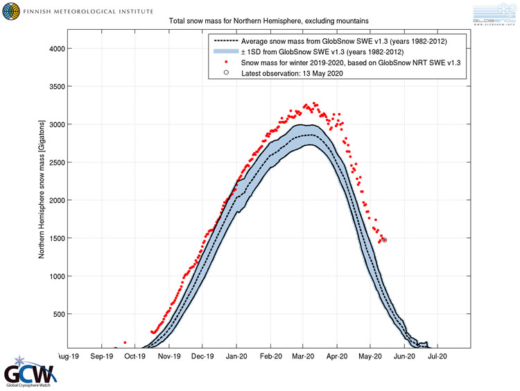 Pohjoisen pallonpuoliskon lumen massa gigatonneina. Kuluvan talven lumimäärä näkyy kuvassa punaisella, viimeisin havainto 13.5.2020. Vuosien 1982–2012 keskimääräinen lumen massa näkyy kuvassa mustalla katkoviivalla. Tiedot satelliittihavainnoista ja maanpintamittauksista. Ilmatieteen laitos ja WMO Global Cryosphere Watch.