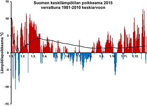 Suomen keskilämpötilan poikkeama 2015 verrattuna 1981-2010 keskiarvoon.´Mustalla viivalla on kuvattu vuoden siihenastinen lämpötilapoikkeama.