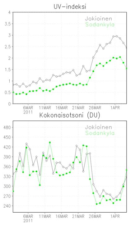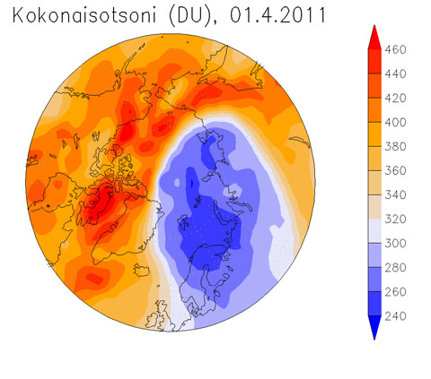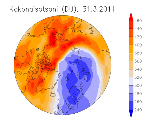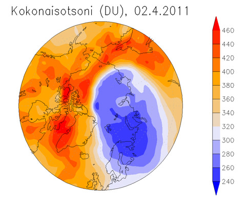 Normaalisti tähän aikaan vuodesta kokonaisotsonin määrä Suomen yllä on noin 400 Dobson yksikköä [DU] ja nyt määrä laskee 260 Dobson yksikköön. Otsonia on siis tällä hetkellä n. 35 prosenttia vähemmän kuin normaalisti tähän aikaan vuodesta. Tilanne näyttää ennusteissa jatkuvan ainakin huhtikuun alkuun. Poikkeuksellisen kylmät lämpötilat 20 kilometrin korkeudella stratosfäärissä yhdessä yhä korkeiden ilmakehän otsonia tuhoavien aineiden pitoisuuksien kanssa ovat johtamassa tänä keväänä ennätykselliseen otsonikatoon pohjoisilla alueilla.Arvioiden mukaan ilmastonmuutos johtaa siihen, että alailmakehässä lämpötilat nousevat ja ylempi ilmakehä kylmenee. Samalla myös Arktisen alueen otsonikerros kylmenee. Arktisilla alueilla se voi tarkoittaa sitä, että olosuhteet otsonikadolle tulevat otollisimmaksi.
