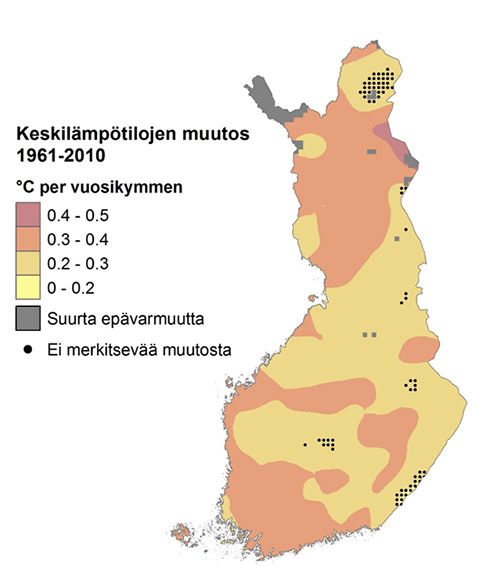 Kuvassa on uuden hila-aineiston perusteella arvioitu vuoden keskilämpötilojen muutos (°C per vuosikymmen) viimeisen viidenkymmenen vuoden aikana. Harmailla alueilla hila-aineistoon liittyy suurta epävarmuutta ja mustien pisteiden kohdalla muutos ei ole ollut tilastollisesti merkitsevää.