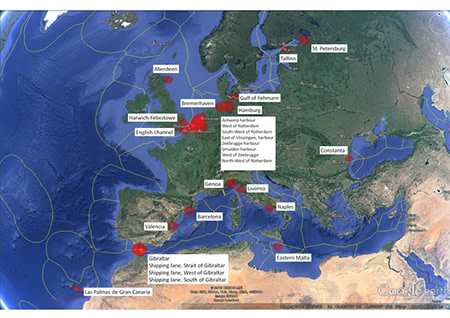 Euroopan merkittävimmät laivaliikenteen päästöalueet hiilidioksidille vuonna 2011. Kuvassa on esitetty 30 merkittävintä päästöaluetta. Ympyröiden pinta-ala on verrannollinen hiilidioksidin päästöihin vuodessa.