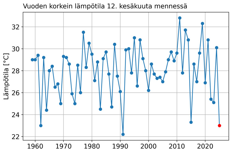 Kuluvan kesän korkein lämpötila on ollut tähän mennessä 23,0 astetta, joka mitattiin 25. toukokuuta Ilomantsissa. Viimeisen 67 vuoden aikana kesäkuun 12. päivään mennessä ylin lämpötila on jäänyt alhaisemmaksi ainoastaan vuonna 1991.