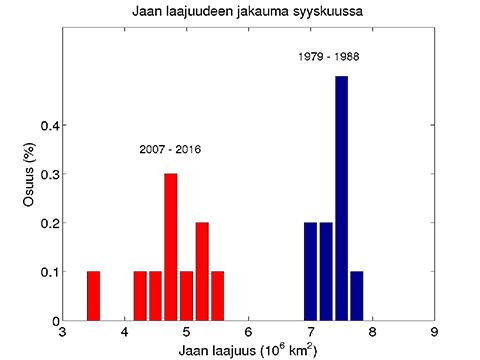 Kuva 2. Merijään syyskuun laajuuden jakaumat vuosina 1979 – 1988 ja 2007 - 2016