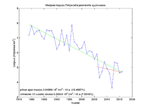 Vuoden 2012 syyskuussa mitattu 3,7 miljoonaa neliökilometriä on koko mittausjakson tähän mennessä mitattu pienin määrä. "Vuosien välinen ero on normaalia ilmaston vaihtelevuutta, mutta samalla merijään laajuus on pienentynyt koko mittausjakson ajan. Muutos on yli 13 % vuosikymmenessä", Ilmatieteen laitoksen yksikön päällikkö Jari Haapala toteaa ja muistuttaa, että merten jääpeite on yksi ilmastonmuutoksen tärkeimmistä indikaattoreista.
