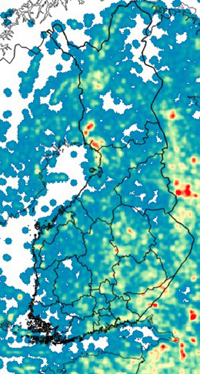 Kuva: maasalamatiheys 2017 (23.7. mennessä). Punainen väri on 4 salamaa sadalle neliökilometrille, muut värit ovat tätä alhaisempia arvoja.