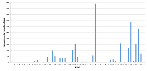 Kuva: vuorokausisalamamäärät Suomessa kesä-heinäkuussa (23.7. mennessä).