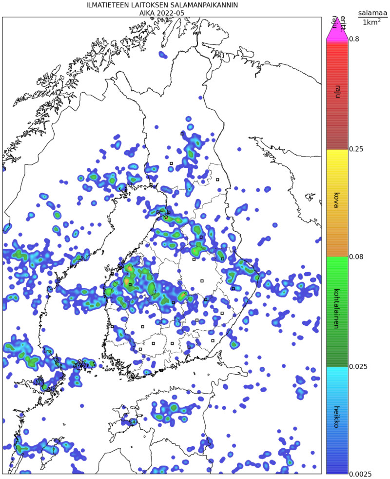 Tämän vuoden toukokuussa maasalamoita havaittiin Suomessa reilut 1 400, mikä on selvästi vähemmän kuin vuosien 1960–2021 keskiarvo, 8 000 maasalamaa. ”Heikkoja ja kohtalaisia ukkosia esiintyi toukokuussa ripotellen, mutta melko tasaisesti ympäri Suomea. Voi sanoa, että ukkoskausi on lähtenyt käyntiin hitaasti”, Ilmatieteen laitoksen tutkija Terhi Laurila sanoo. Kesäkuussa on tähän mennessä havaittu noin 3 600 maasalamaa. Viime päivät ovat olleet kesän toistaiseksi salamarikkaimpia: sunnuntaina 12.6. havaittiin 700 maasalamaa, maanantaina 13.6. noin 1 500 maasalamaa, ja tällekin päivälle on ennustettu ukkosia. Suomen ukkoskausi ulottuu toukokuusta syyskuuhun. Lähes puolet ukkoskauden salamoista havaitaan tyypillisesti heinäkuussa, mutta vuosien välillä vaihtelu on suurta. Esimerkiksi viime vuonna runsain salamointi osui kesäkuuhun.