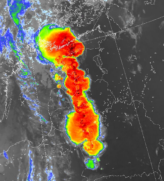 Kiira-rajuilman pilviä NOAA-18 -satelliitin kuvaamana. Värit esittävät lämpötilaa; punaiset ja mustat alueet ovat kylmimpiä eli pilvet korkempia. Kuva: Panu Lahtinen