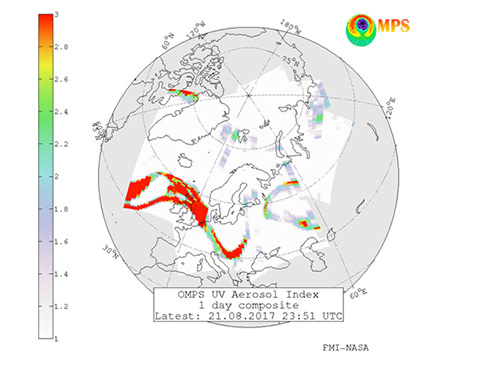 Ilmatieteen laitoksen satelliittihavaintojen pohjata tekemistä aerosolikartoista näkyy, kuinka Kanadan metsäpaloista peräisin olevat savut saapuvat Euroopan ylle. Oheinen kartta näyttää tilanteen maanantaina 21. elokuuta. Nämä metsäpalojen savut kulkeutuvat yläilmakehässä, eivätkä ole havaittavissa maanpinnalla. Savuilla ei ole vaikutusta myöskään hengitysilmaan.
