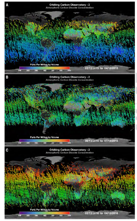 Ensimmäiset NASAn OCO-2 (Orbiting Carbon Observatory-2) -satelliitin mittaukset ovat tuottaneet uutta ja entistä kattavampaa tietoa ilmakehän hiilidioksidin alueellisesta vaihtelusta. Tietoa on saatu esimerkiksi El Niño -sääilmiön aiheuttamista hiilidioksidipitoisuuksien muutoksista tropiikissa ja hiilidioksidin vuodenaikaisvaihtelusta, joka aiheutuu kasvillisuuden kasvukauden rytmittymisestä.