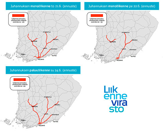 Liikennevirasto arvioi, että myös perjantaina 22.6. juhannuksen menoliikenne on kohtalaisen vilkasta varsinkin kello 10 ja 13 välillä.