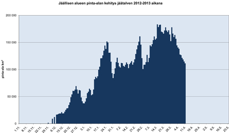Tilastoihin taakse jäävä jäätalvi jää lähes normaaliin aikaan alkaneena ja laajuudeltaan keskimääräisenä. Luonteeltaan jäätalvi on kuitenkin ollut poikkeuksellinen muun muassa siksi, että jääalan laajuus vaihteli voimakkaasti talven aikana. Esimerkiksi vuoden 2012 päättyessä jäätilanne vastasi ajankohdan keskimääräistä tilannetta, mutta heti vuodenvaihteen jälkeen sää lauhtui ja jäät sulivat. Loppiaisena sää kylmeni jäälleen ja jään määrä alkoi lisääntyä siten, että tammikuun 25. päivänä jäällisen alueen laajuus oli 152 000 km². Jäätilanne vastasi tuolloin ankaraa jäätalvea 2009 - 2010. Sitten sää taas leutoni ja tammikuun päättyessä jäällinen alue oli pienentynyt 84 000 km²:iin ja tilanne oli hiukan keskimääräistä jäljessä. –Vasta alkava kevät kertoo, millainen jäätalvesta lopulta kokonaisuudessaan muodostuu, Jouni Vainio toteaa.