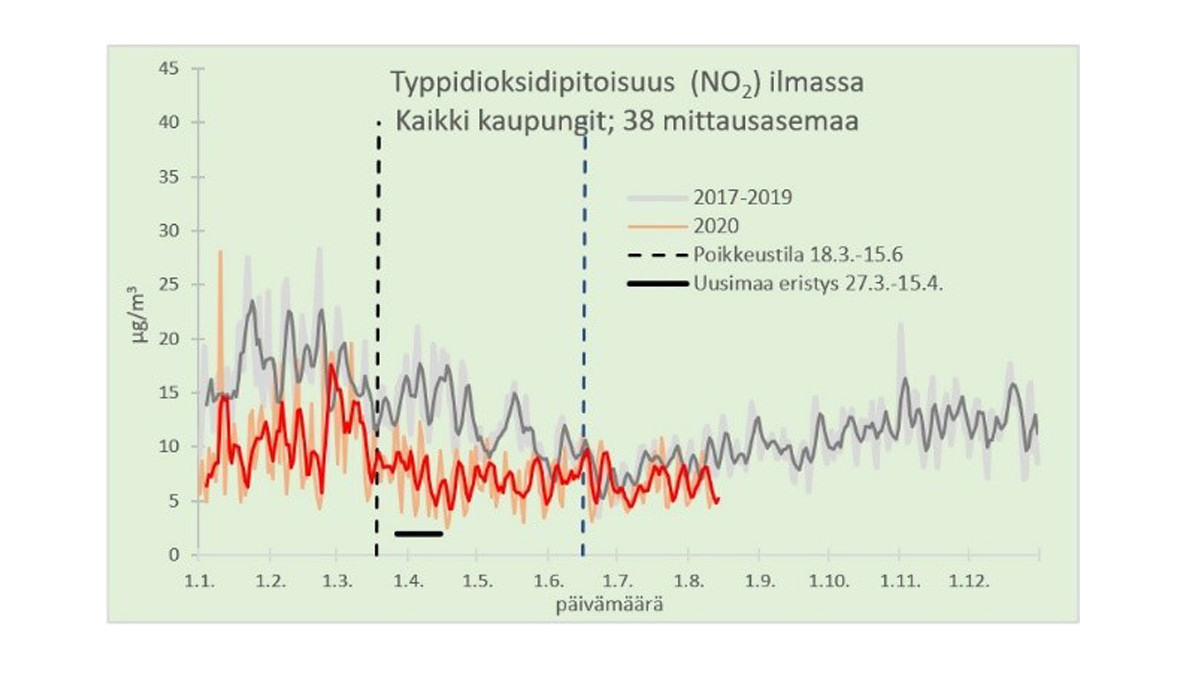 Koronapandemian pysäyttämiseksi asetetut liikkumisrajoitukset paransivat ilmanlaatua Suomessakin. Liikenteen päästöjen väheneminen aiheutti selkeimmät muutokset kaupunki-ilman typpidioksidipitoisuudessa, mutta muutkin tutkitut saasteet osoittivat vähenemisen merkkejä poikkeustilan aikana.