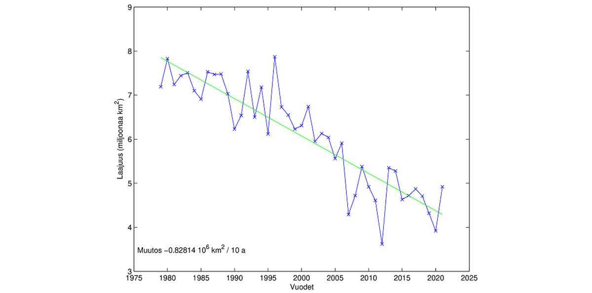 Tämän vuoden syyskuussa merijään laajuus oli 4,9 miljoonaa neliökilometriä. ”Se on hieman enemmän kuin viimeisen kymmenen vuoden aikana keskimäärin, mutta selkeästi vähemmän kuin keskimäärin koko havaintohistorian aikana”, sanoo tutkija Jaakko Seppänen Ilmatieteen laitokselta.