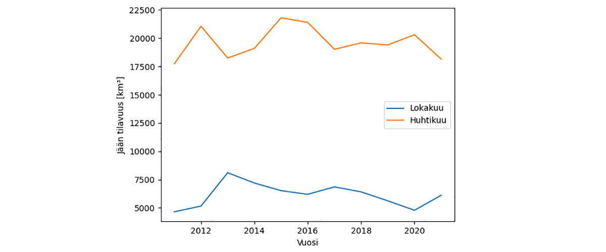 Keskimääräinen muutos jään tilavuudessa vuodesta 2011 on pieni verrattuna vuosittaiseen vaihteluun, mutta jään paksuuden jakauma oli tämän vuoden lokakuussa viime vuosiin verrattuna poikkeuksellinen. Jään paksuus oli itäisellä pallonpuoliskolla selvästi suurempi ja läntisellä puolestaan matalampi verrattuna keskiarvoon 2011–2020. Koillisväylä on jäätynyt nopeasti Itä-Siperian merellä, mutta samalla paksuin monivuotinen jää Grönlannin ja Kanadan pohjoispuolella on ohentunut merkittävästi.