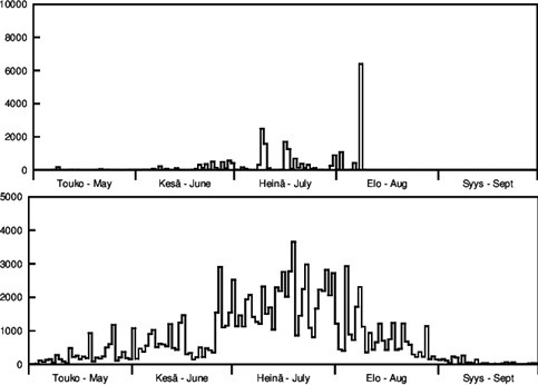 Kuva 2. Suomen maasalamamäärät vuorokaudessa toukokuun alusta elokuun 9. päivään asti.