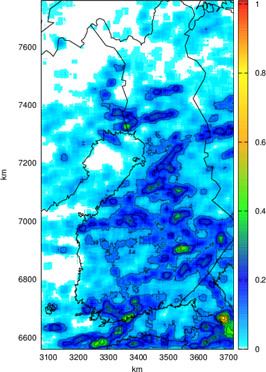 Kuva 1. Maasalamatiheys (salamoita neliökilometriä kohden) toukokuun alusta elokuun 9. päivään asti.