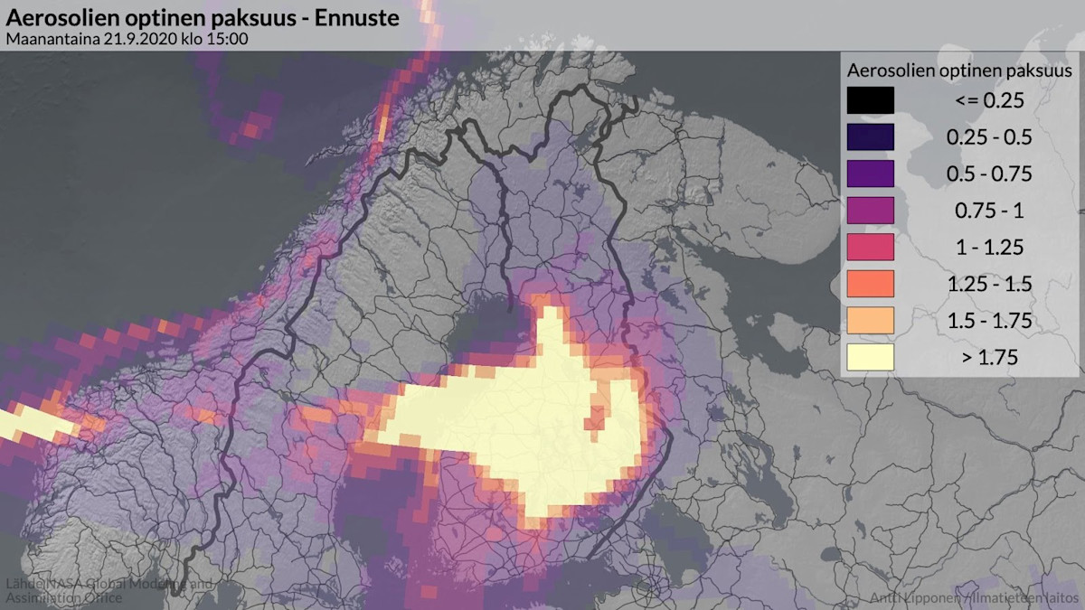 “NASAn tuottaman ennusteen perusteella savupilvi Suomen yllä olisi suurimmillaan tänään iltapäivällä ja illalla. Paksuimmillaan savupilvi on maan keskivaiheilla, Etelä-Suomessa ja Lapissa savua on ohuemmalti”, sanoo tutkija Antti Lipponen Ilmatieteen laitokselta.