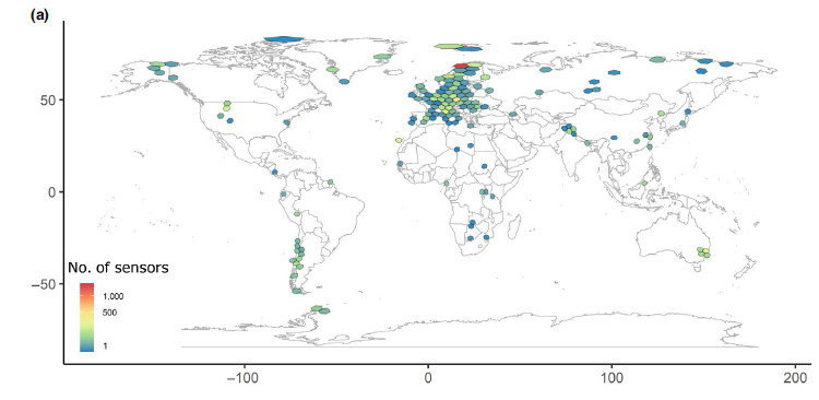 Kuva: SoilTemp -tietokannan tämänhetkinen alueellinen kattavuus. Tulevaisuudessa uusia mittauksia keskitetään erityisesti niille alueille, jotka ovat tällä hetkellä huonosti edustettuina (Kuva: Lembrechts et al., 2020).