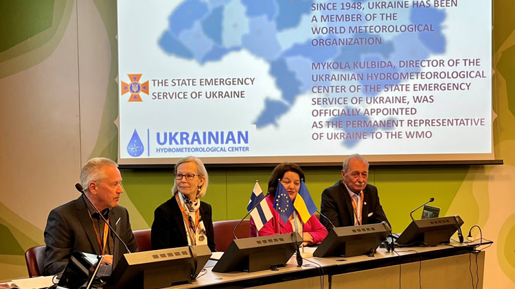 Suomen Ilmatieteen laitos ja Ukrainan hydrometeorologinen keskus UHMC järjestivät Maailman ilmatieteen järjestö WMO:n kongressin yhteydessä sivutapahtuman tiistaina 30. toukokuuta. Tilaisuuden tavoitteena oli vahvistaa Ukrainan ja sen kansainvälisten kumppanien välistä yhteistyötä, jotta UHMC kykenee paremmin tuottamaan luotettavaa ja oikea-aikaista sää-, ilmasto- ja ennakkovaroitustietoa.